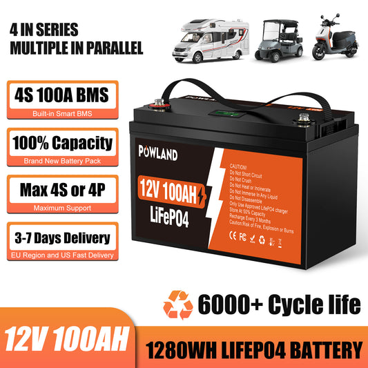 POWLAND LiFePO₄ Battery 12V-100AH BMS Series and Parallel Connection Rechargeable